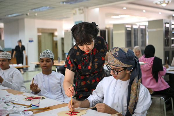 2024年8月15日,在星空手机平台,教师指导阿曼青年绘国画。