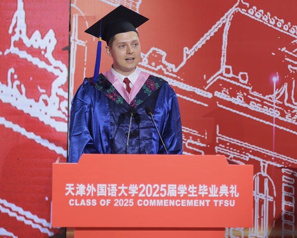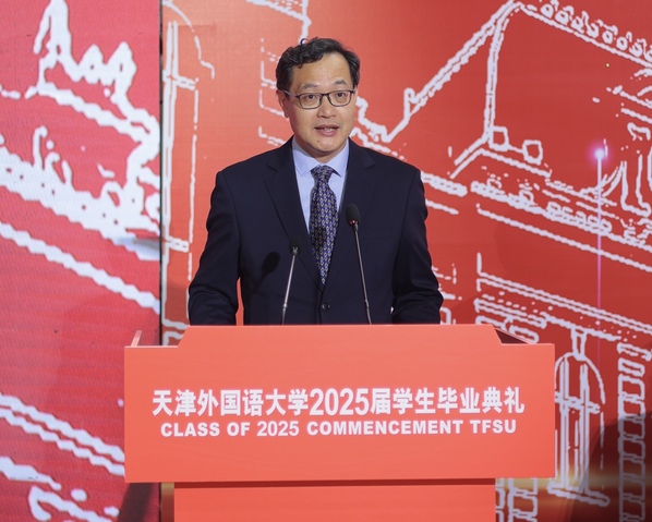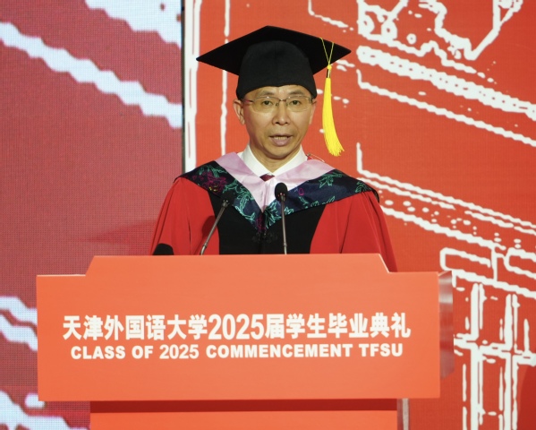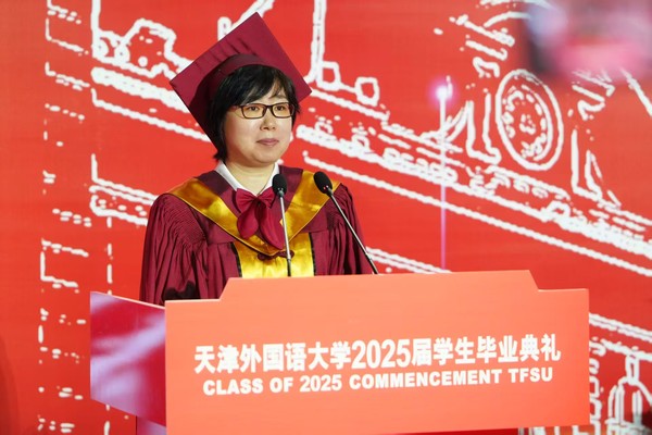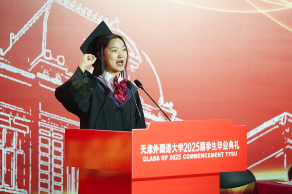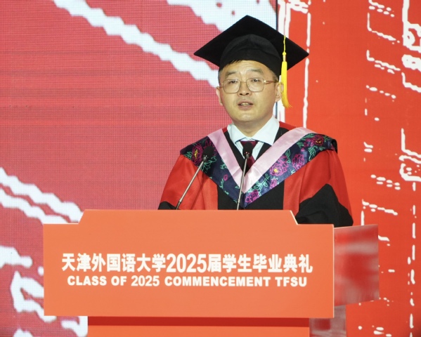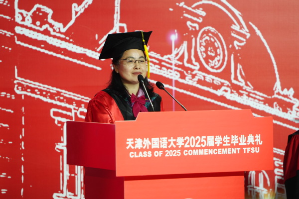 国际商学院吴晨阳、国际教育学院留学生小康代表2025届全体毕业生发言,深情款款,信心满怀。教师代表英语专业教师李媛霞的深情嘱托感动人心,许下跨越山海的重逢约定。我校1998届日语专业校友、上海和泰丰田叉车有限公司总经理、星空手机平台上海校友会会长、上海市天津商会理事胡海涯勉励毕业生带着勇气前行,坚持自己的理想,书写属于自己的人生篇章。