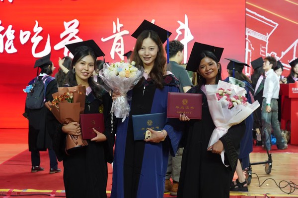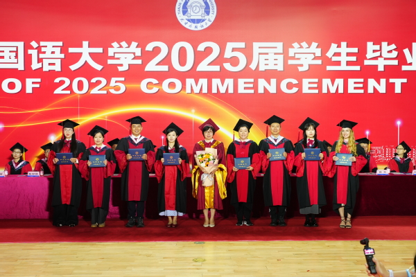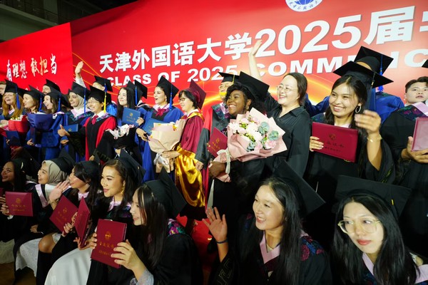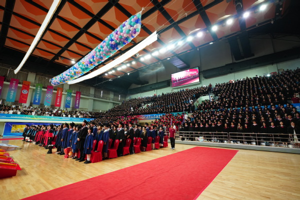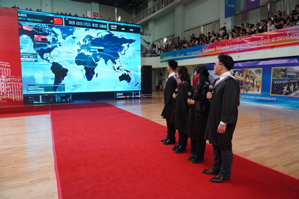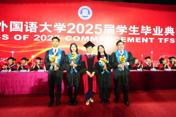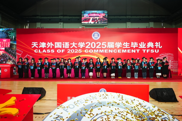 和光同尘,与时舒卷;薪火相传,奋飞不辍。31种外文书写的毕业祝福标语和吊旗环绕体育馆四周,祝福毕业生扬帆启航。在《最初的梦想》《海阔天空》等经典旋律中,“快闪”演出拉开了典礼的序幕,在校生为学长学姐的祝福、教师代表的亲情演唱迅速点燃了现场氛围。各学院精心制作的视频《青春不散场》、学校毕业视频《初“信”》把同学们在天外的点点滴滴接连重现,激励他们赓续薪火,再谱新篇。