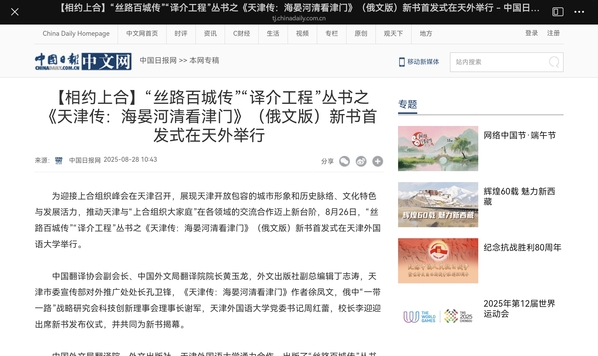 中国新闻网报道《天津传:海晏河清看津门》(俄文版)新书首发式在天外举行