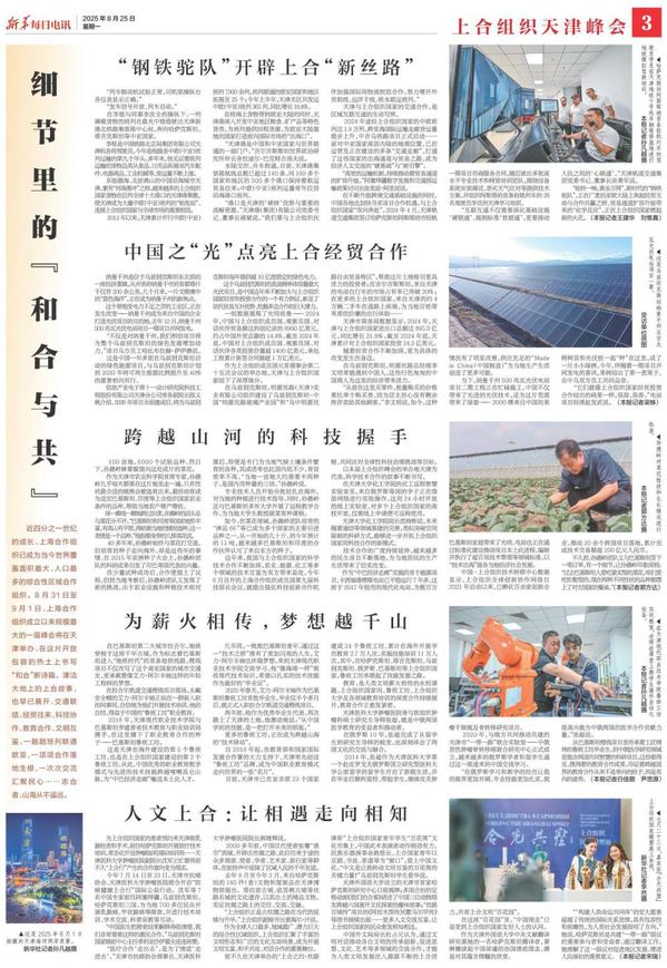 近四分之一世纪的成长,上海合作组织已成为当今世界覆盖面积最大、人口最多的综合性区域合作组织。8月31日至9月1日,上海合作组织成立以来规模最大的一届峰会将在天津举办,在这片开放包容的热土上书写“和合”新诗篇。津沽大地上的上合故事,也早已展开,交通联结、经贸往来、科技协作、教育合作、文明互鉴,一趟趟班列联通欧亚,一项项合作落地生根,一次次交流汇聚民心……志合者,山海从不遥远。