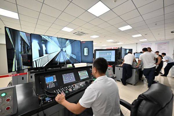 哈萨克斯坦阿斯塔纳首条轻轨列车的驾驶员学员在天津地铁10号线车辆维修基地进行地铁模拟驾驶培训。(新华每日电讯记者孙凡越摄)