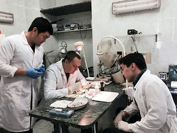 张超(左)在和俄罗斯学者一同进行医学实验。受访者供图