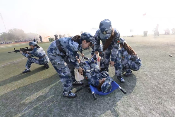 步履铿锵壮歌行,呼声震天破长空。在军事技能展示环节,学生军训团成员与承训部队教官英姿焕发、势如雷霆,匕首操的凌厉、应急棍的刚劲、战术表演的逼真和格斗环节的震撼,充分展现了天外学子的过硬作风和中国军人的赤胆豪情,赢得了现场观众阵阵掌声。