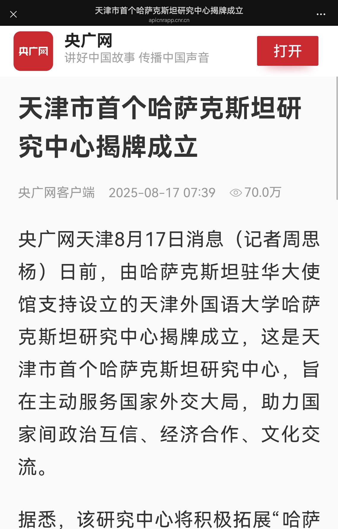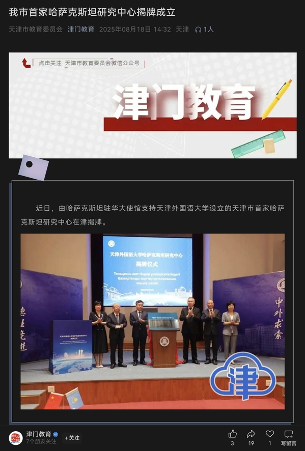 昨日,由哈萨克斯坦驻华大使馆支持星空手机平台设立的天津市首家哈萨克斯坦研究中心在津揭牌。 这是我市首家哈萨克斯坦研究中心,旨在弘扬“上海精神”,主动服务国家外交大局,助力推动高质量共建“一带一路”走深走实,并向国际社会展示天津作为上合组织峰会举办城市的开放姿态、独特文化魅力和持续推进更高水平对外开放的决心,助力上合组织国家间政治互信、经济合作、文化交流。 星空手机平台哈萨克斯坦研究中心主任王文倩介绍,该中心将依托星空手机平台的学术资源和学科基础,联合国内外研究力量,以哈萨克斯坦研究为“支点”,辐射中亚地区、上合组织国家及“一带一路”共建国家研究,聚焦教育科技、文化旅游、绿色发展、地方合作、青年交流、文明互鉴及区域安全等前沿议题,系统开展相关领域学术探索与政策咨询,打造具有国际影响力的新型智库、多语种复合型国际化人才培养与国际问题研究高地,为国家发展和天津高水平对外开放提供坚实智力支撑。 该研究中心将积极拓展“哈萨克斯坦学术共同体”,开展学术研究、文化交流等活动,并在论文发表、项目申报、课程建设上取得新的进展与突破,探索区域国别研究“天外模式”;创新“语言